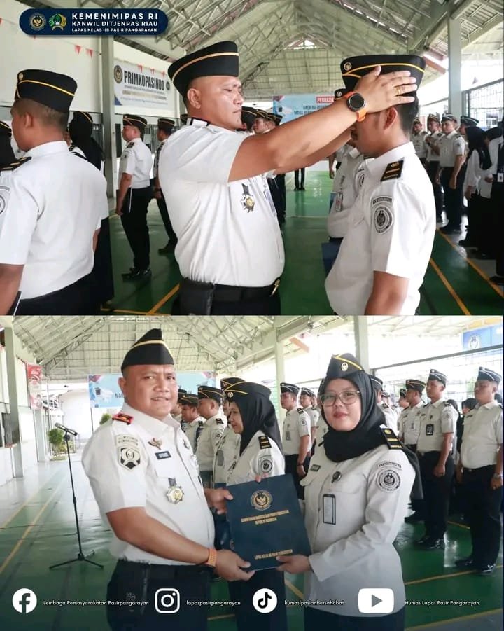 PASIR PENGARAIAN, Nadipos.id – Lembaga Pemasyarakatan Kelas IIB Pasir Pengaraian melaksanakan apel pagi yang dirangkaikan dengan prosesi penyematan kenaikan pangkat serta pemberian penghargaan Pegawai Teladan Bulan Januari 2026. Kegiatan tersebut berlangsung di hall layanan kunjungan Lapas Pasir Pengaraian, Senin (23/2/2026).