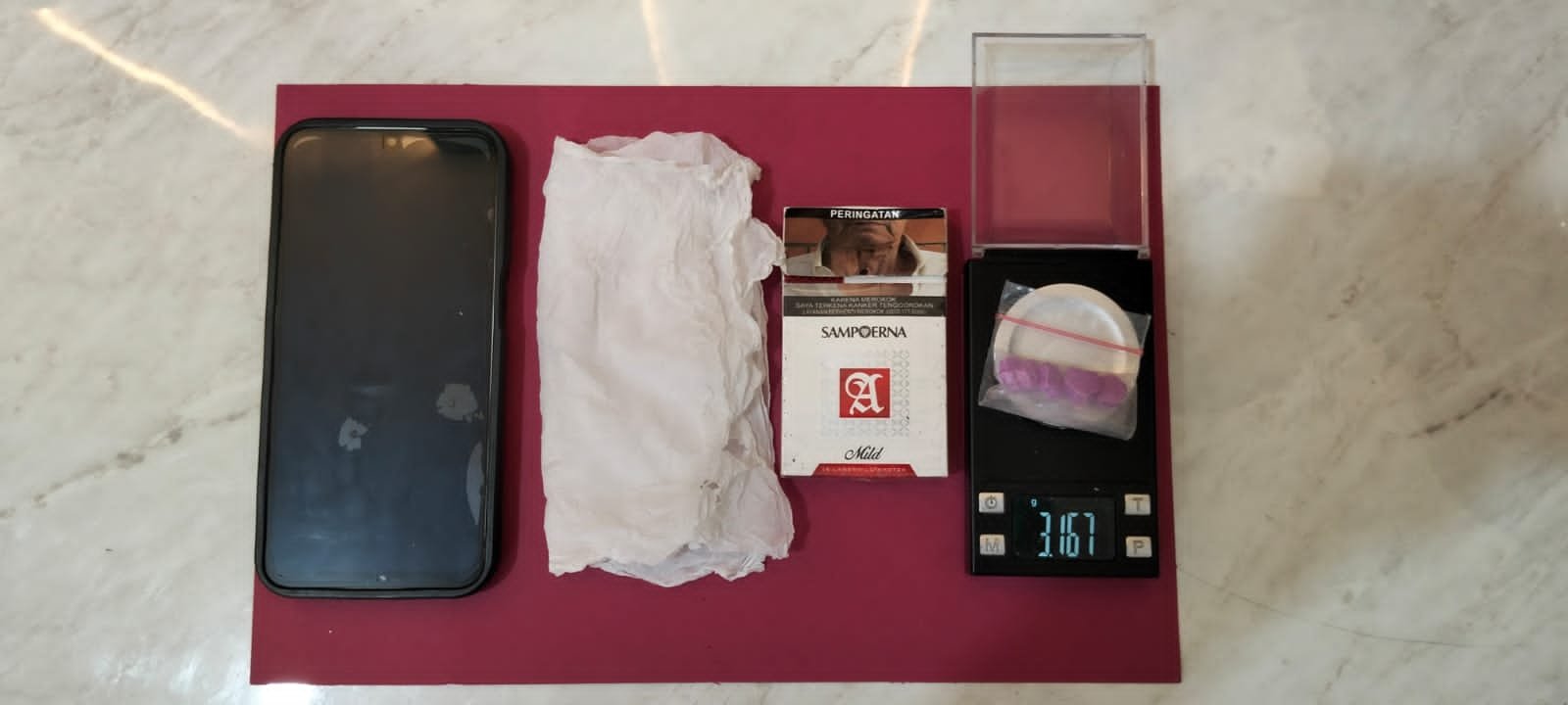 Dari hasil penggeledahan di kamar pelaku, ditemukan barang bukti berupa 6 butir pil ekstasi berwarna ungu, 1 lembar tisu, 1 bungkus rokok, dan 1 unit handphone.