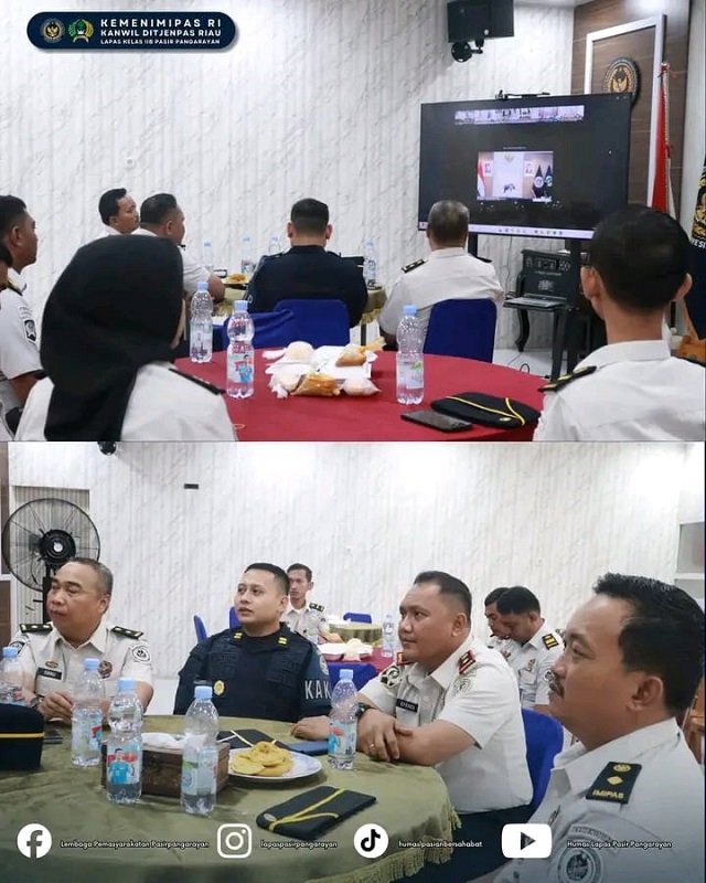 PASIR PENGARAIAN, Nadipos.id – Lembaga Pemasyarakatan (Lapas) Kelas IIB Pasir Pengaraian mengikuti kegiatan pengarahan dari Direktur Jenderal Pemasyarakatan (Dirjenpas) Kementerian Imigrasi dan Pemasyarakatan secara daring. Kegiatan yang berlangsung pada Senin (06/04) ini diikuti langsung oleh Kepala Lapas Pasir Pengaraian, Efendi Parlindungan Purba, bersama jajaran pejabat struktural dari ruang aula Lapas Pasir Pengaraian